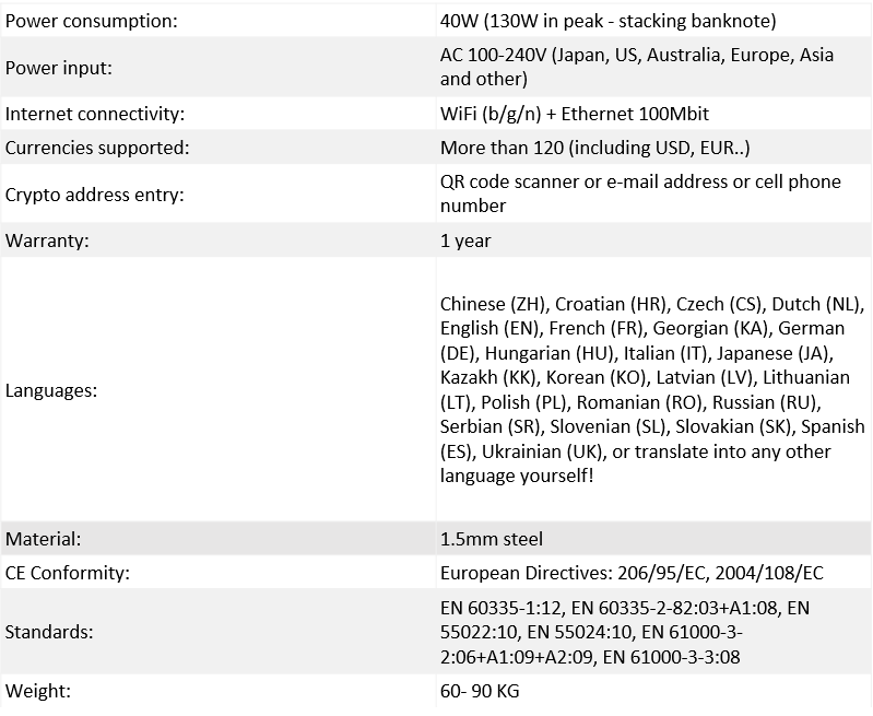 Unidirectional or Bidirectional (cash to cryptocurrency or cryptocurrency to cash), able to access cryptocurrency from a wallet or crypto-exchange to convert and distribute funds to the customer. Eye-catching design with color changing neon light, naturally drawing the attention of bystanders.